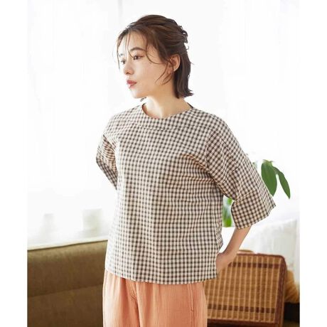 テキスタイルが可愛いチェック柄の素材を使用したゆったりショート丈のプルオーバーブラウス。たっぷりの身幅にドロップショルダーのデザインは楽ちんな着心地。暑い時期には快適にお召しいただけます。袖口はターンアップ可能なお仕立てですので、お袖を少し短く出来ます。衿ぐりはコンパクトなクルーネックですっきり。衿ぐりは後ろファスナー明きです。シンプルな着こなしの際にも存在感があり、コーデが決まる一枚です。