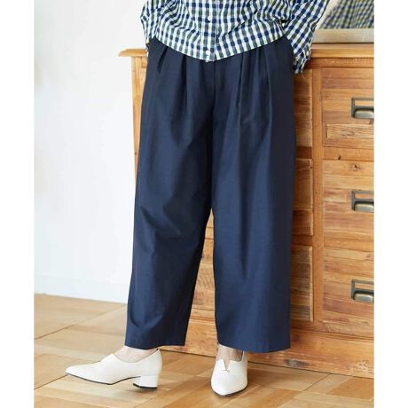 総ゴム仕様で、着脱がラクにできるワイドストレートパンツです。ハリ・コシのある生地を活かし、前ウエストには左右にボックスタックのアクセントを施しています。ボリュームを抑えつつ、自然ですっきりとしたシルエットに仕上げています。ウエストはリラックス感のある履き心地ながら、きれいめのラインをキープできるため、カジュアルからオフィスまで幅広く活躍し、快適さと上品さを両立した一枚になっています。