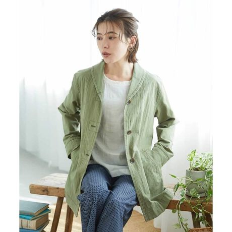 裏なしの一重仕立てで、軽やかに羽織れるジャケットコート。アームホールの縫い代以外は布の裁ち目が見えない仕様にしているため、内側までスッキリと美しい仕上がりです。小ぶりでやさしい印象のショールカラーは、後ろ中心にさりげない刻みを入れることで、シンプルながらも表情のあるデザインに。顔まわりを柔らかく見せてくれます。ゆったりとしたシルエットとストンと落ちる袖は、体の動きを妨げず快適な着心地です。袖口は外側へ折り返したデザインなので、お好みの長さに調整可能です。季節やコーディネートに合わせてアレンジも楽しめます。また、生地より少し濃いステッチ糸を使用することで、全体をさりげなく引き締めた印象に。シンプルでありながら、上品さと程よい存在感を兼ね備えています。