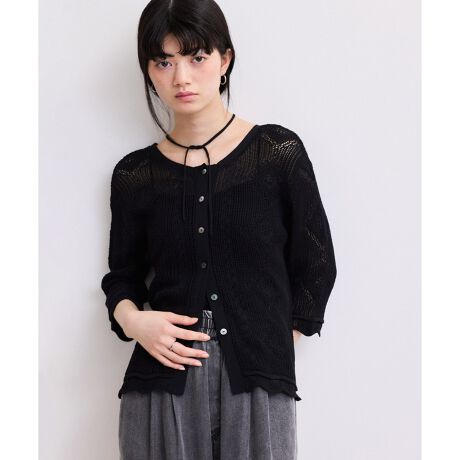 クロシェライクなザクっとした編み地を組み合わせ、袖口や裾にスカラップの編み地を施しポイントに。