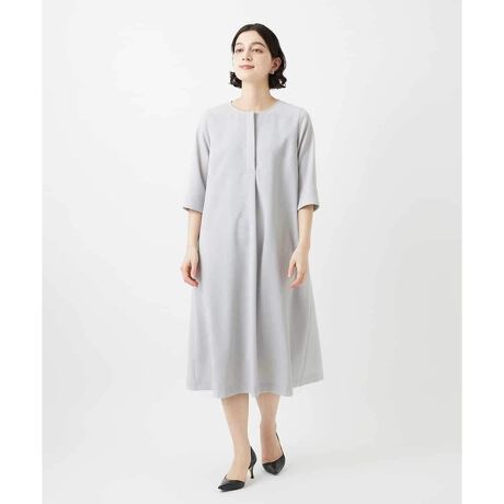 クルーネックのすっきり7分袖丈のワンピース。身頃にタックデザインを加えフレアの動きと立体感をつくり体型カバーにもなるワンピースです。袖口にはスリットがあり、肘が曲げやすく、またターンアップしての袖丈調節もOK。シンプルデザインのワンピースだからこそ、アクセサリーや靴、羽織やアウターが合わせやすくて自由にコーデが楽しめるワンピースです。同素材の ジャケット【NHDGF88330】やノーカラージレ【NHDGF89260】とのセットアップスタイルも楽しめます。同素材のパンツ【NHLGF88190】もございます。