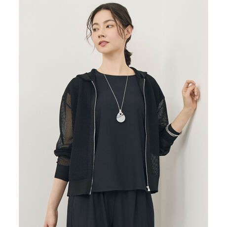 ニットの気軽さに女性らしさを添えたジップパーカー■デザイン程よいボリューム感と、袖のエレガントなフォルムが特徴のジップパーカーです。ニットならではの気軽さがありながら、素材感とシルエットで女性らしさを引き立てたデザインに仕上げています。温度調節や日よけとしても、さっと羽織っていただけます。■素材目面が美しく、形をきれいに保ちやすい、上品な光沢感が特徴の素材です。軽やかでさらっとした肌触りに、程よいハリ感があり、肌離れの良さもポイントです。自然なドレープが美しく、エレガントなシルエットを演出してくれます。■同素材プルオーバー(KRWMLM0453)