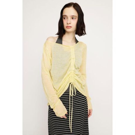 【SHEER KNIT TOPS】■POINT程よい透け感が女性らしいシアーニットトップス。フロントのドローストリングデザインがシンプルながら立体感のあるアイテムです。■DETAILゆるっとしたボディラインと広めに開いたネックラインで肩を落としても着用して頂けるアイテムです。上半身をカバーしながらデコルテ周りを綺麗に見せてくれるのが嬉しいポイント。フロントのドローストリングは紐で調節可能で、お好きな位置まで絞ってシルエットの変化を楽しんで着用していただけます。カラッとしたリネン入りのシアーニットがロングシーズンで活躍するアイテムです。■STYLINGHALTER NECK CUP IN CAMI (030JSR70-1411 )をインナーとして着用したレイヤードしたスタイリングが一押しです。透け感を活かしたレイヤードスタイリングがおすすめです。■FABRIC/MATERIALリネン入りのシアーニット素材を使用。■透け感:あり■光沢感:なし■伸縮性:あり■裏 地:なし※お取り扱い上のご注意・本品は素材の特性上色落ちします。・洗濯、クリーニング、着用(使用)時に他の衣類や雑貨、家具類に色移りする事があります。・特に汗や雨等で湿った状態では、色落ちが顕著になります。・白、淡色との組み合わせは避け、お取り扱いには十分ご注意下さい。・洗濯機表示の場合はネットに入れて弱水流で洗って下さい。・手洗いの場合はもみ洗いを避けて軽く押し洗いして下さい。・洗濯後は、速やかに形を整え干して下さい。・丈の長い製品、袖など伸びやすい箇所はハンガーで支えたり、平干しをすることで型崩れを防止できます。[注意事項]※画像の商品はサンプルです。実際の商品と仕様、加工が若干異なる場合があります。※画像の商品は光の照射や角度、お使いのモニター環境により、実物と色味が異なる場合がございます。※着用、お取り扱いの際は、アテンションタグをご確認ください。※一部予約商品につきましては生産上の都合によりお届け予定日や店頭発売と前後する場合もございます。※追加生産商品は、一部の店舗、通販で販売中の場合がございます。予めご了承下さい。