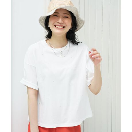 胸元に散りばめられたホットフィットと、さりげないスパンコール刺繍が上品なアクセントのTシャツ。
