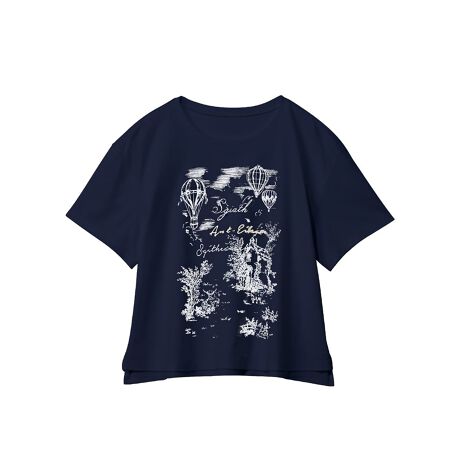 ヨーロッパの風景画のような線画と、空に浮かぶ気球がデザインされたTシャツ。