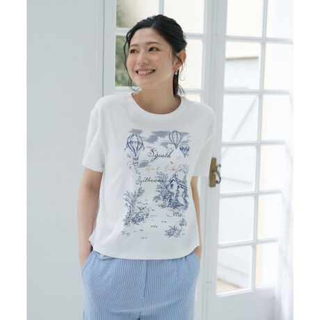 ヨーロッパの風景画のような線画と、空に浮かぶ気球がデザインされたTシャツ。