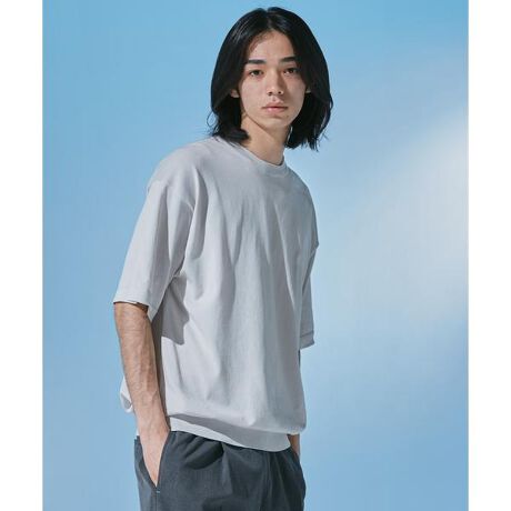 清涼感のある綿ポリエステル糸をハイゲージで編み立てたクルーネック型で、Tシャツに近い半袖デザインに仕上げています。