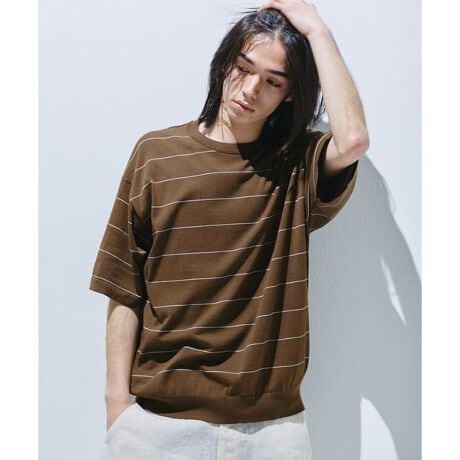 清涼感のある綿ポリエステル糸をハイゲージで編み立てたクルーネック型で、Tシャツに近い半袖デザインに仕上げています。