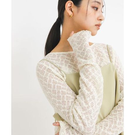 凹凸のあるシュリンクレースを採用したトップス。程よい透け感が女性らしく、アウトスタイルでも決まるラウンドヘム仕様もポイント。少し長めに設定した袖や、デコルテがすっきりと見える広めのネックも特徴的です。インナーとしても重宝する1着です。