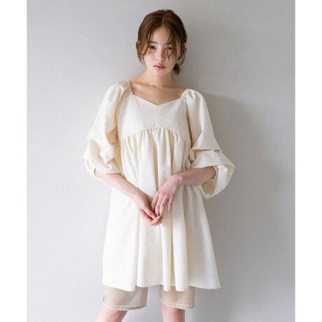 袖に大きくタックをとったデザインがポイントのミニワンピース。衿はスクエアベースの浅いVネック、スクエアネックの前後2WAY仕様になっており、どちら側を前にしてもデコルテをきれいに見せてくれます。体型カバーが期待できるサイジングもポイントです。1枚着はもちろん、パンツをレイヤードした着こなしもおすすめです。