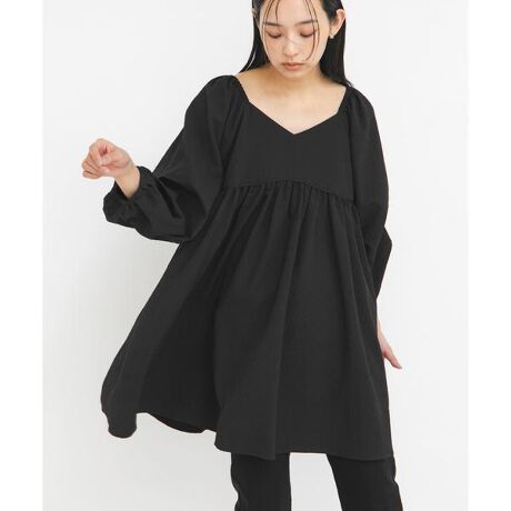 袖に大きくタックをとったデザインがポイントのミニワンピース。衿はスクエアベースの浅いVネック、スクエアネックの前後2WAY仕様になっており、どちら側を前にしてもデコルテをきれいに見せてくれます。体型カバーが期待できるサイジングもポイントです。1枚着はもちろん、パンツをレイヤードした着こなしもおすすめです。