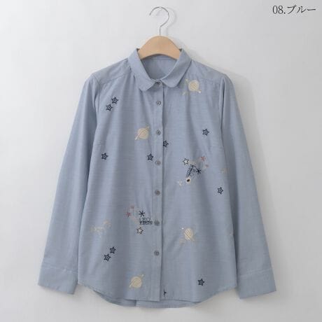 星や惑星などのギャラクシーなモチーフ刺繍が目を惹くデザインシャツ。