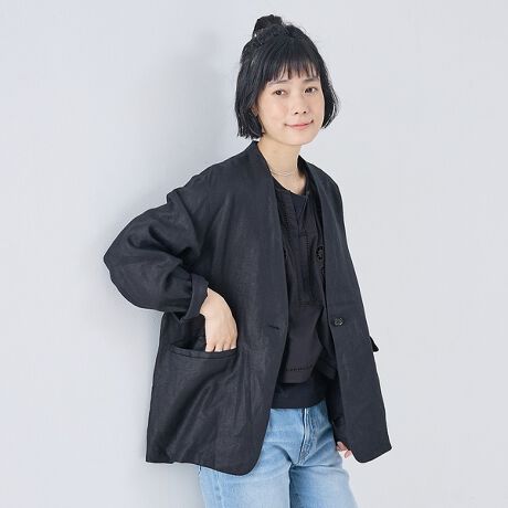 清涼感のあるリネン100%素材を使用した、Vネックのノーカラージャケット。