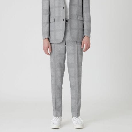 クレストブリッジチェック柄をプリントしたカラミ織り素材トラウザーズ。シャープな印象を持たせる細身のシルエットながらも、ウエスト部分にはゴムシャーリングを施し快適な履き心地。ビジネスからカジュアルまで両方の用途に使用できるデザインです。