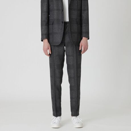 クレストブリッジチェック柄をプリントしたカラミ織り素材トラウザーズ。シャープな印象を持たせる細身のシルエットながらも、ウエスト部分にはゴムシャーリングを施し快適な履き心地。ビジネスからカジュアルまで両方の用途に使用できるデザインです。