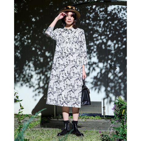 英国リバティ社のプリントデザイン(単色の花:Theodore Manor)を使用したロング丈のシャツワンピース。