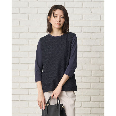 滑らかな素材のカットソーに繊細なレースを重ねた、立体感と高級感のある初夏のプルオーバー。