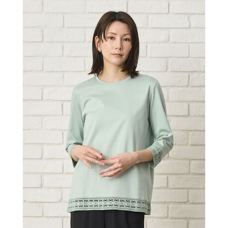 1枚でもインナーでも活躍し、裾レースがさりげない華やかさを添える7分袖デザインです。