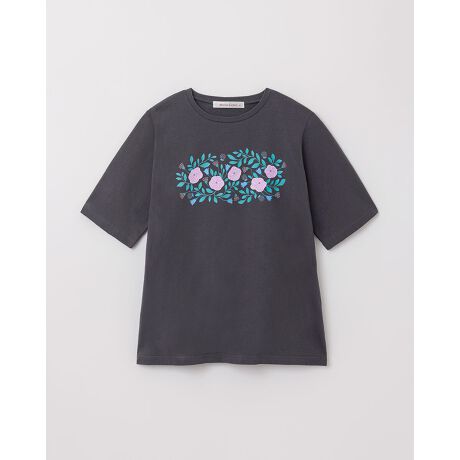 オーガニックコットン100%のやわらかな素材の着心地に、花と葉の優しいタッチの柄が映えるデザイン。