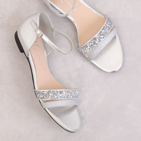 ・足首がきれいに見えるように計算された華奢ストラップと華やかなラメで、フラットでも大人っぽく履けます。