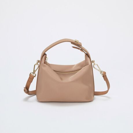 上品な光沢感のあるナイロンにレザーのハンドルを組み合わせた、キレイめにもカジュアルにも合わせやすいデザイン。