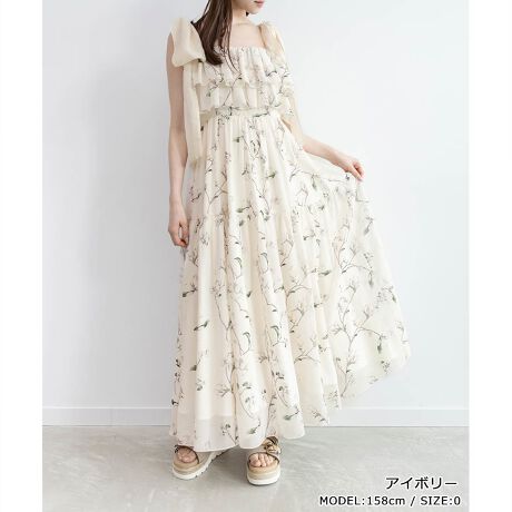 大柄のフラワープリントとショルダーのリボンデザインが目を惹くシフォンワンピース。