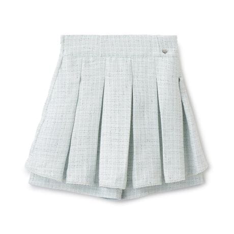 タックを入れた女の子らしいシルエットが魅力的なフレアショートパンツです。高級感のあるツイード生地に、ハートモチーフを添えた上品なデザイン。ウエストにはアジャスターつきのゴムが入っています。ハンカチなどの持ち運びに役立つ右ポケットもうれしいポイントです。【おすすめの着用時期は春夏シーズン】