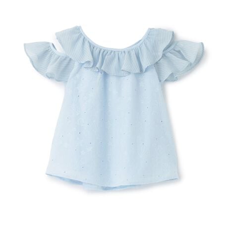 衿元と肩のフリルにはストライプのシアーなシフォンをプラス。