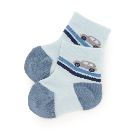 車がラインの上を走っているような遊び心あふれるデザインのクルーソックスです。