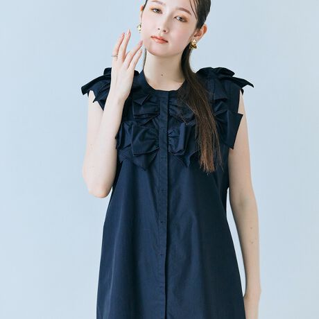 ・きちんと見えするシャツ素材に、リボンモチーフでかわいらしさもUP。