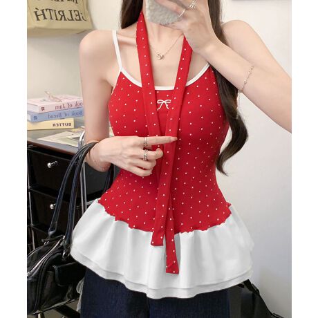 ドット柄×ネックリボンが目を引く、フリルティアードのキャミソール。