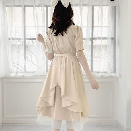 上品なシャツワンピースの後ろには、ふんわり揺れるチュールが仕込まれており、女の子らしい印象漂う一品に。