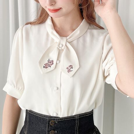 タイにあしらった小花刺繍がキュートなブラウス