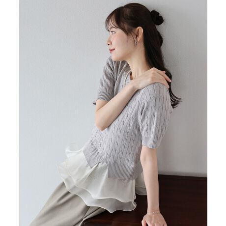 ケーブル編みできれいめな印象の半袖ニットに光沢感のあるオーガンジー生地をドッキングした大人ガーリーな一着。
