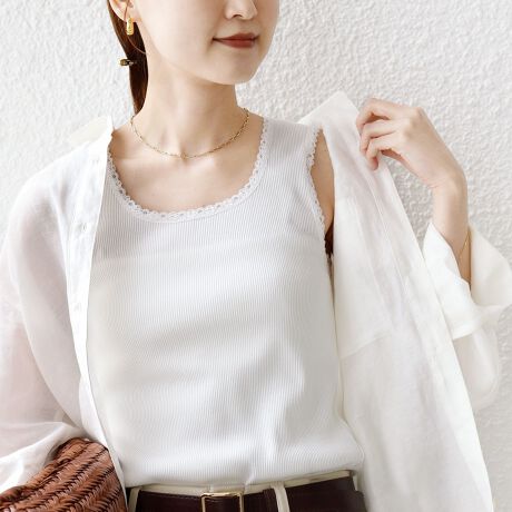 控えめで上品なレースをトリミングした前後2WAYのタンクトップです。