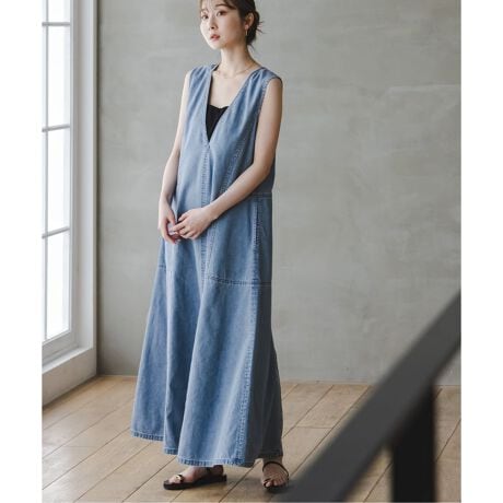 テントラインのようなフレアシルエットが着用するだけで気分上がるデニムロングワンピース。