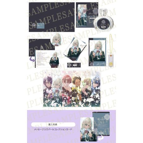キャラクターの香りをイメージした「香水」に加えて、描き下ろしイラストを使用した「缶バッジ、カード型アクリルスタンド、アクリルカード」と、書き下ろしメッセージの入った「メッセージカード」、「ボトルチャーム」がセットになったフレグランスBOXにアクリルパネルが付属しています。