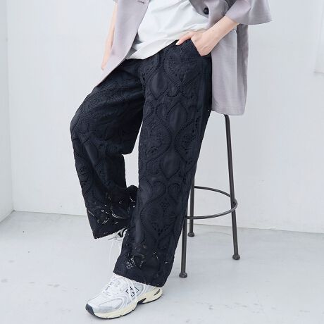 楽に履けるウエストゴム・紐仕様に加え、レース素材で涼しく軽やかに着られ、高見えも叶える一本です。