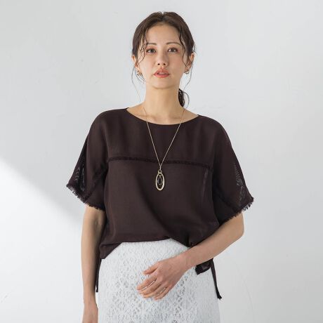 ジャケットと好相性のフレンチスリーブデザイン。袖口・裾・フロントにはヨーク切り替えを施し、フリンジを挟み込むことで立体感と華やぎをプラス。一枚で着ても着映えするデザインに仕上げました。