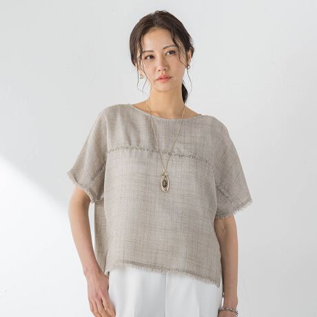 ジャケットと好相性のフレンチスリーブデザイン。袖口・裾・フロントにはヨーク切り替えを施し、フリンジを挟み込むことで立体感と華やぎをプラス。一枚で着ても着映えするデザインに仕上げました。