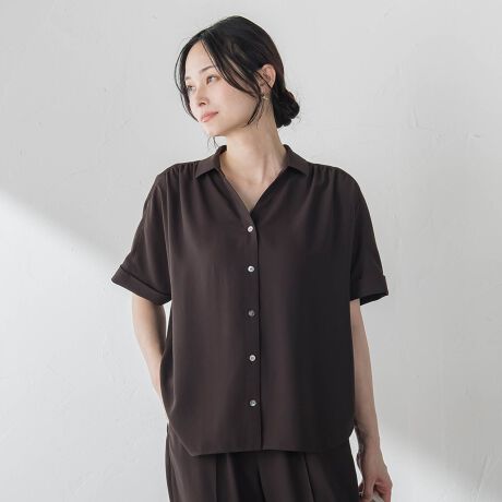 シャツ衿のハンサムなデザインですが、前の肩部分にギャザーを施しており、さらに抜け衿のデザインにすることで、着用時により女性らしく着ていただける工夫をしております。