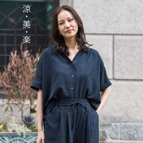 シャツ衿のハンサムなデザインですが、前の肩部分にギャザーを施しており、さらに抜け衿のデザインにすることで、着用時により女性らしく着ていただける工夫をしております。