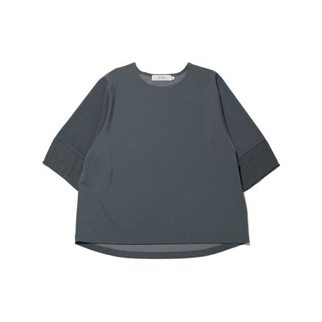 袖口に透け感のある布帛を切り替えたドッキングデザインがさりげないアクセントになり、シンプルながらもこなれ感のある印象に。