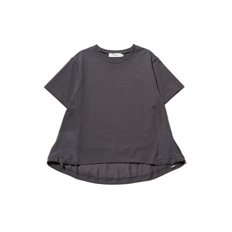 後ろ裾部分にはシアー調の布帛切替を施し、さりげない透け感と立体感をプラス。裾脇のドロストでシルエットを自在にアレンジできるデザインになっています。前後差のある着丈は後ろを長めに設定し、ヒップラインを自然にカバー。