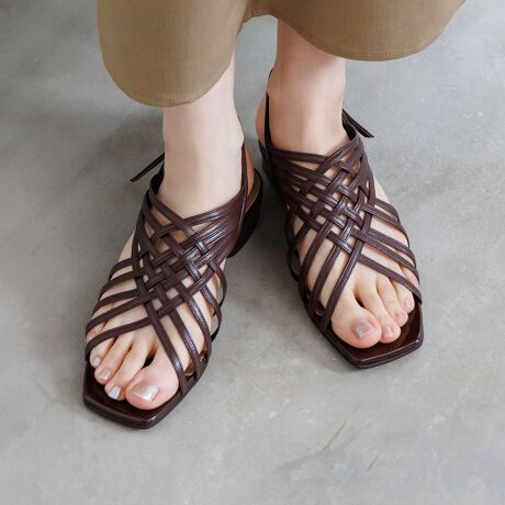 モードな雰囲気のケージストラッピーデザインが目を引くローヒールサンダル。カジュアルになりすぎず、さまざまなコーディネートに取り入れやすい大人の一足に仕上げました。