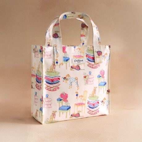 Cath Kidstonで人気のブックバッグの使いやすいスモールサイズ。特徴的なシルエットはそのままに、より小さく便利なサイズです。コーティングされた光沢のあるコットンは拭くことができ、お手入れも簡単です。デザインの主役は、Cath Kidstonで愛されているキャラクター、ウィペットのバイオレットとコーギーのクイニー。とびきりのおめかしをして、クッションや椅子の上にちょこんと座る姿が、優しく柔らかなトーンで描かれています。