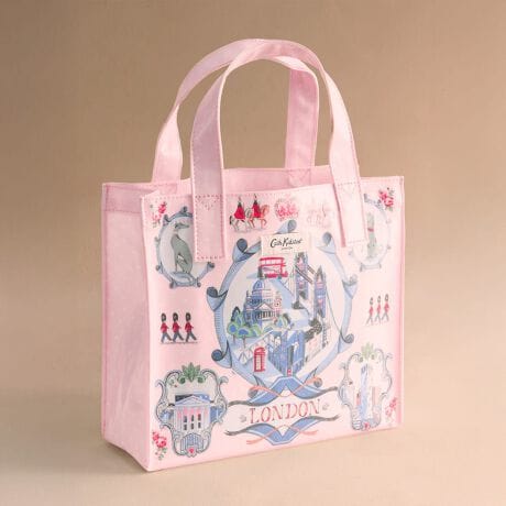 Cath Kidstonで人気のブックバッグの使いやすいスモールサイズ。特徴的なシルエットはそのままに、より小さく便利なサイズです。コーティングされた光沢のあるコットンは拭くことができ、お手入れも簡単です。タワーブリッジや赤い2階建てバスといったロンドンの象徴的な景色を、ブランドの代名詞である繊細な花々と共に、美しいブルーのトーンで描き出しました。Cath Kidstonを代表するキャラクターたちも顔を覗かせ、街の魅力を余すところなく表現しています。