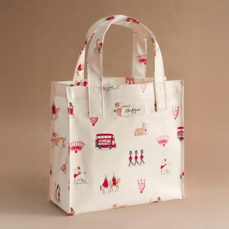 Cath Kidstonで人気のブックバッグの使いやすいスモールサイズ。特徴的なシルエットはそのままに、より小さく便利なサイズです。コーティングされた光沢のあるコットンは拭くことができ、お手入れも簡単です。ロンドンのアイコニックな風景に、Cath Kidstonらしい遊び心をプラスしました。近衛兵や馬、そして様々なポーズをとるスタンリーとその仲間たちまで、キャラクター一人ひとりが愛情と個性たっぷりに描かれています。