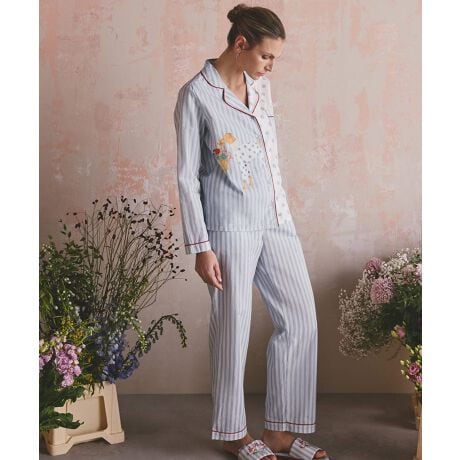 トラディショナルなボタンスルーのパジャマ。ストライプ柄に、イラストとリンクしたドット柄が組み合わさった遊び心溢れるデザインです。トリムの赤がアクセントを加えます。デザインの主役は、Cath Kidstonで愛されているキャラクター、ウィペットのバイオレットとコーギーのクイニー。とびきりのおめかしをして、クッションや椅子の上にちょこんと座る姿が、優しく柔らかなトーンで描かれています。