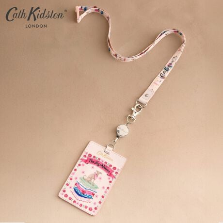 [型番:W7641001]光沢のあるコーティングされたコットンで作られ、パスやカードを付けるための金属クリップが付いています。デザインの主役は、Cath Kidstonで愛されているキャラクター、ウィペットのバイオレットとコーギーのクイニー。とびきりのおめかしをして、クッションや椅子の上にちょこんと座る姿が、優しく柔らかなトーンで描かれています。